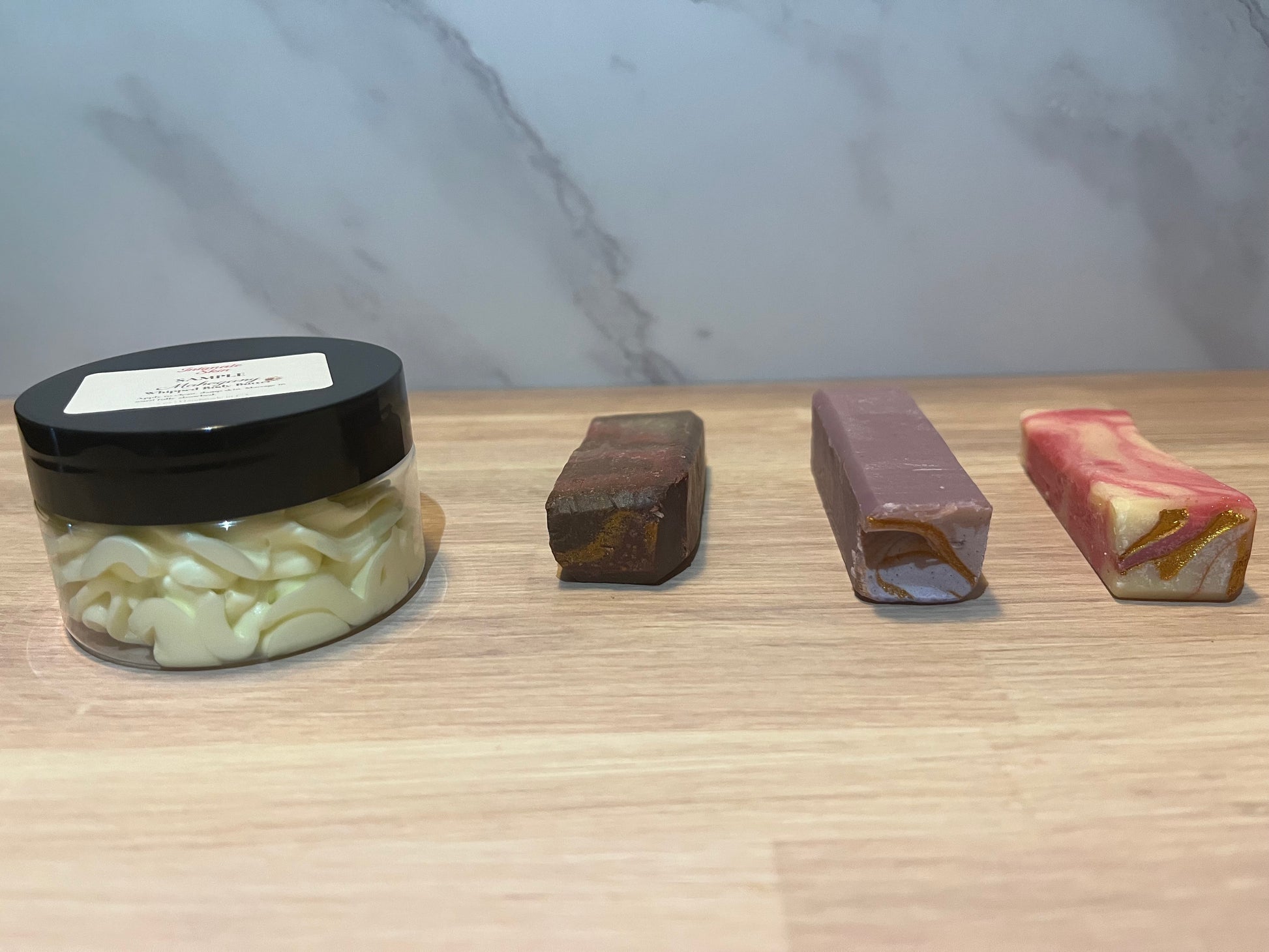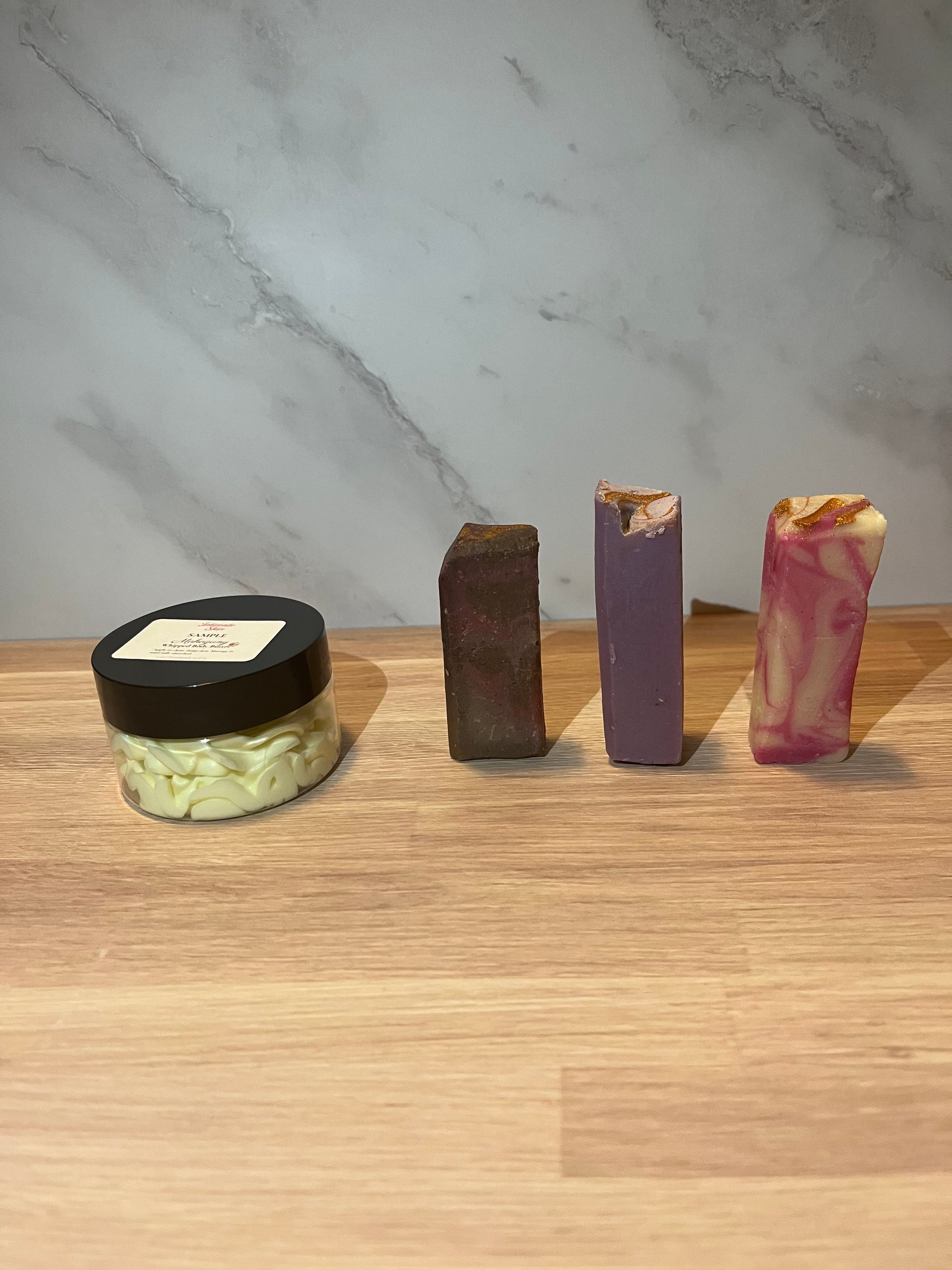 Use daily as you would our full-size products. Keep soaps dry between uses for longevity. Body butter melts into clean, dry skin—best after a shower to lock in moisture.